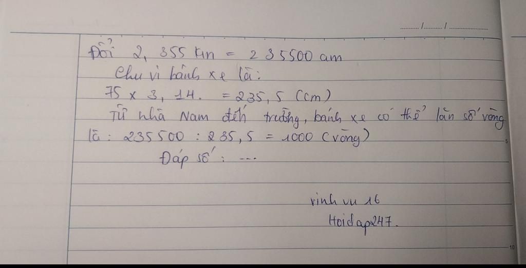 Nam đi từ nhà đến trường bằng xe đạp. Biết quãng đường đó dài 2,355km và đường kính bánh xe 75cm. Hỏi từ nhà Nam đến trường, một bánh xe đạp sẽ lăn bao nhiêu vòng?