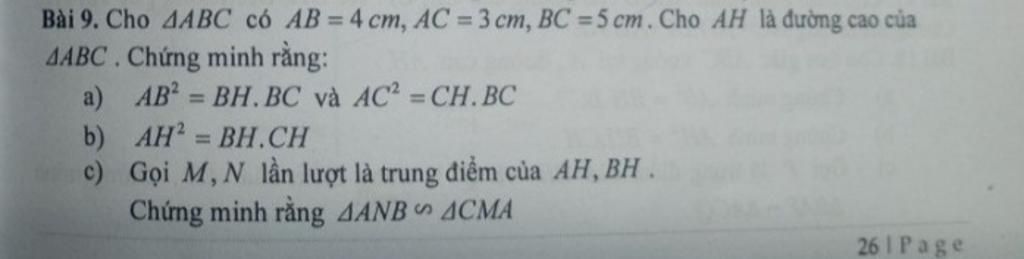 c.Ta có: $ \Delta CAH\sim\Delta ABH, M, N$ là trung điểm $HA, HB$
