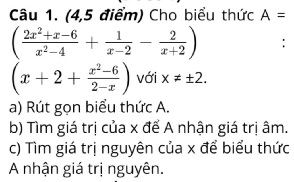 `a) A =((2x^2 + x - 6)/(x^2-4) + 1/(x-2) - 2/(x+2)) : (x+2+ (x^2-6)/(2-x))`