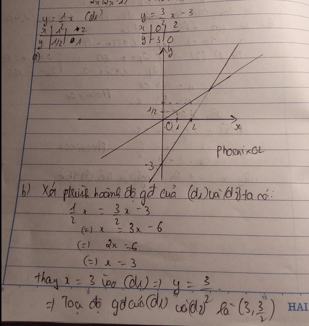 cho hàm số y=1/2x có đồ thị là (d1)và hàm số y=3/2x-3 có đồ thị là (d2)