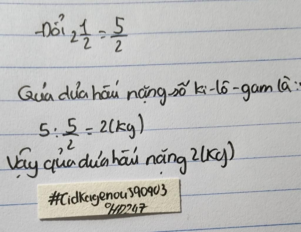Biết 2 và 1/2 quả dưa hấu nặng 5kg. Vậy quả dưa hấu nặng bao nhiêu kg?