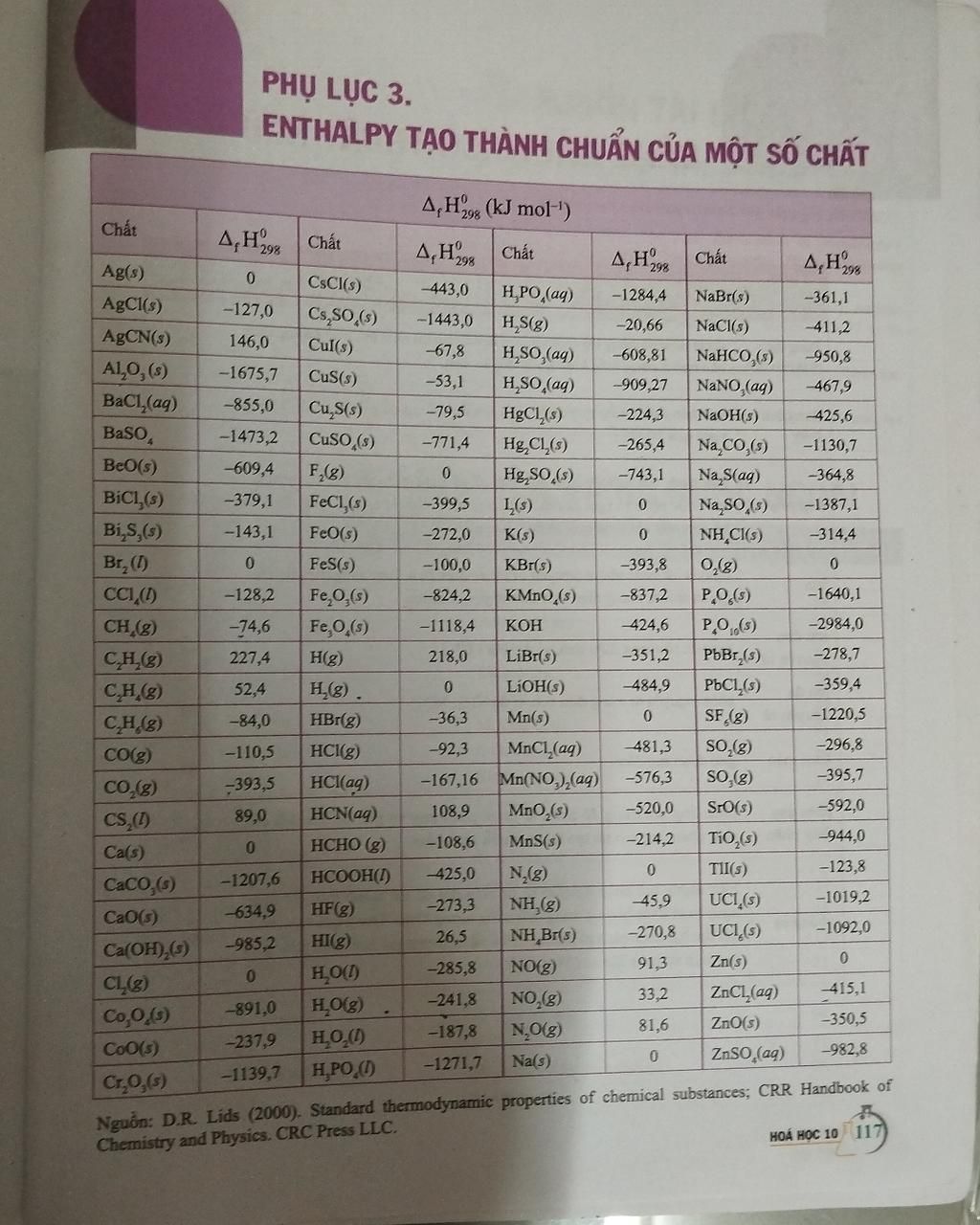 b. Dựa vào giá trị enthalpy tạo thành chuẩn của các chất ( phụ lục 3- ảnh), tính biến thiên enthalpy và phản ứng của các phản ứng đốt cháy trên
