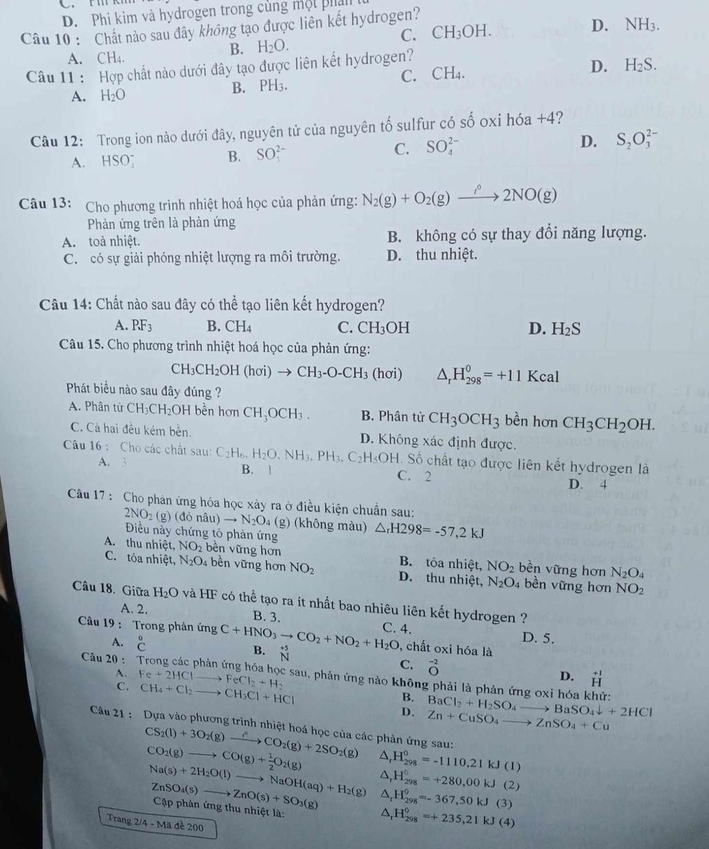 C11 Lk hydrogen là lk giữa H và nto có độ âm điện cao như F,O,N ngoại lệ là C2H5OH,CH3OH
