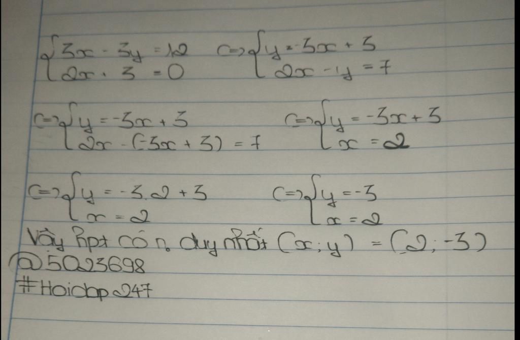 begin{cases} 3x-3y=12\\2x+3=0 \end{cases} `->` thêm \ trc begin