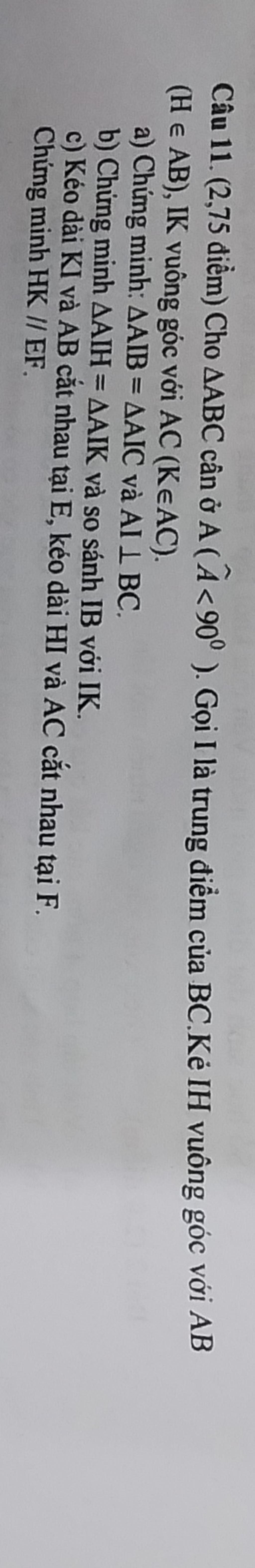 Câu 11. (2,75 điểm) Cho AABC cân ở A (Â<90° ). Gọi I là trung điểm của BC.Kẻ IH vuông góc với AB
