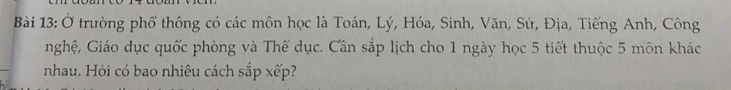 Bài 13: Ở trường phổ thông có các môn học là Toán, Lý, Hóa, Sinh, Văn, Sử, Địa, Tiếng Anh, Công