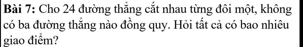 Số giao điểm của 24 đường thẳng cắt nhau mà không có ba đường thẳng nào đồng quy là: `276` giao điểm