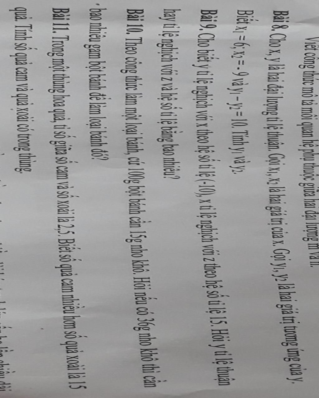 Bài 9. Cho biết y tỉ lệ nghịch với x theo hệ số tỉ lệ (-10), ...