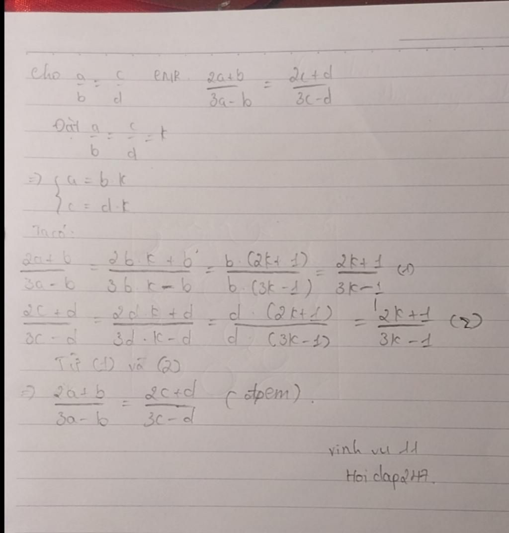 Ta có: `\frac{2a+b}{3a-b}=\frac{2c+d}{3c-d}`