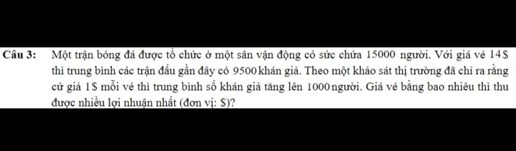 Một trận bóng đá được tổ chức ở một sân vận động có sức chứa15000 người. Với giá vé14 $ thì trung bình các trận đấu gần đây có9500 khán giả. Theo một khảo sát thị trường đã chỉ ra rằng cứ giả1 $ mỗi vé thì trung bình số khán giả tăng lên1000 người. Giá vé bằng bao nhiêu thì thu được nhiều lợi nhuận nhất