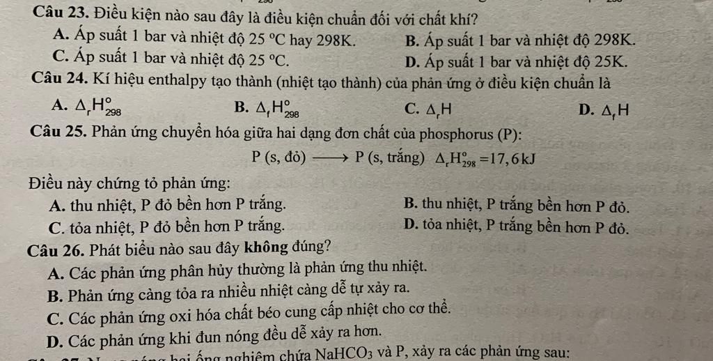 C26 D sai vì có những phản ứng tỏa ra nhiệt hoặc thu nhiệt không cần phải cung cấp nhiệt