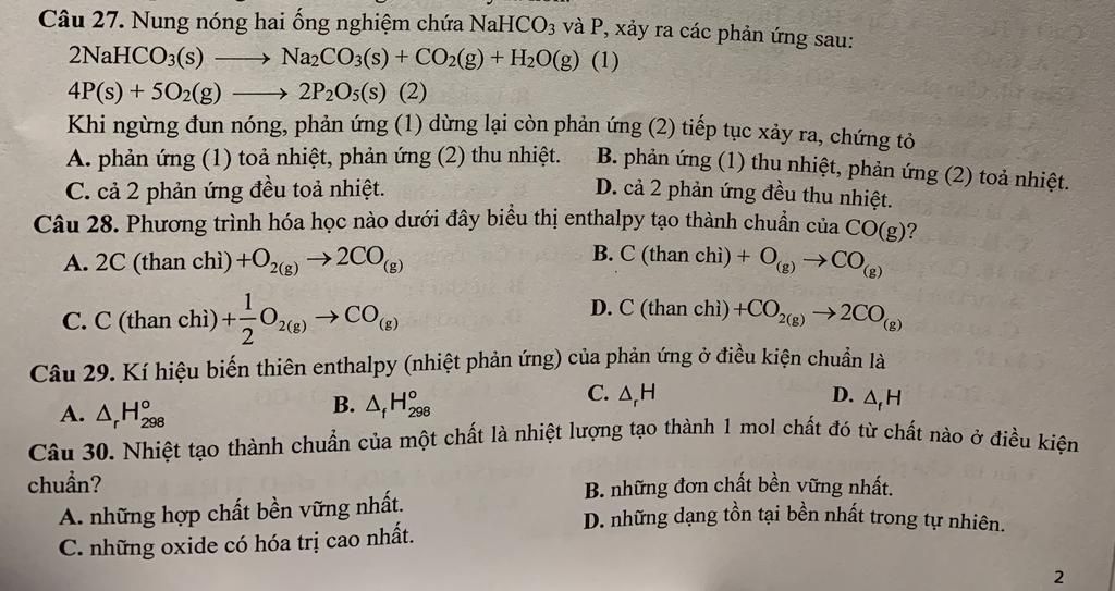 C27 Phản ứng 1 là thu nhiệt vì quá trình nung này cần cung cấp nhiệt liên tục =>> cần lấy nhiệt từ môi trường =>> Đó là phản ứng thu nhiệt