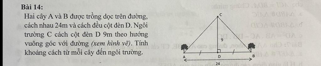 Vậy khoảng cách từ mỗi cây tới trường là `15m`