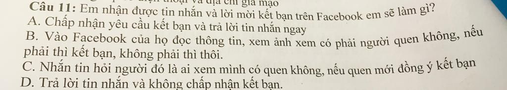 Câu 11: Em nhận được tin nhắn và lời mời kết bạn trên Facebook em sẽ làm gi
