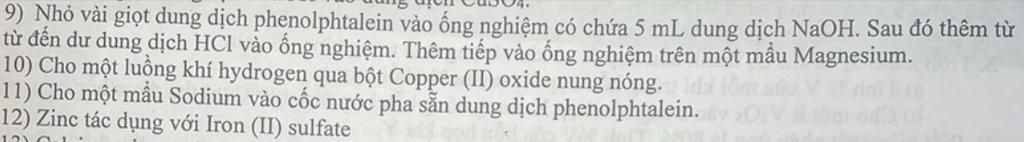 Dung dịch NaOH sẽ chuyển màu hồng nếu nhỏ dung dịch phenoltalein. Khi thêm từ từ đến dư dung dịch `HCl` vào dung dịch `NaOH`, dung dịch sẽ bị mất màu. Khi thả mẩu magnesium vào dung dịch trên sẽ thoát ra khí `H_2`