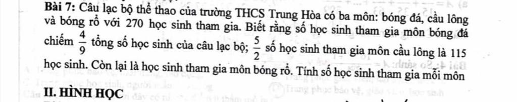 Vậy số học sinh tham gia môn bóng đá,cầu lông,bóng rổ lần lượt là: `120` học sinh; `46` học sinh; `104` học sinh