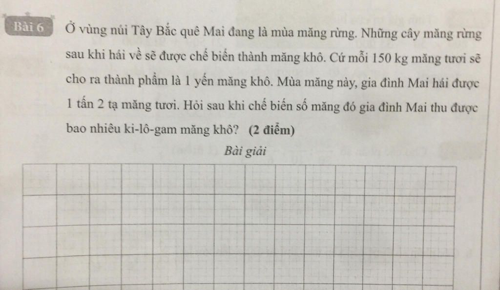 Sau khi chế biến `1` tấn `2` tạ măng tươi, nhà Mai thu được: