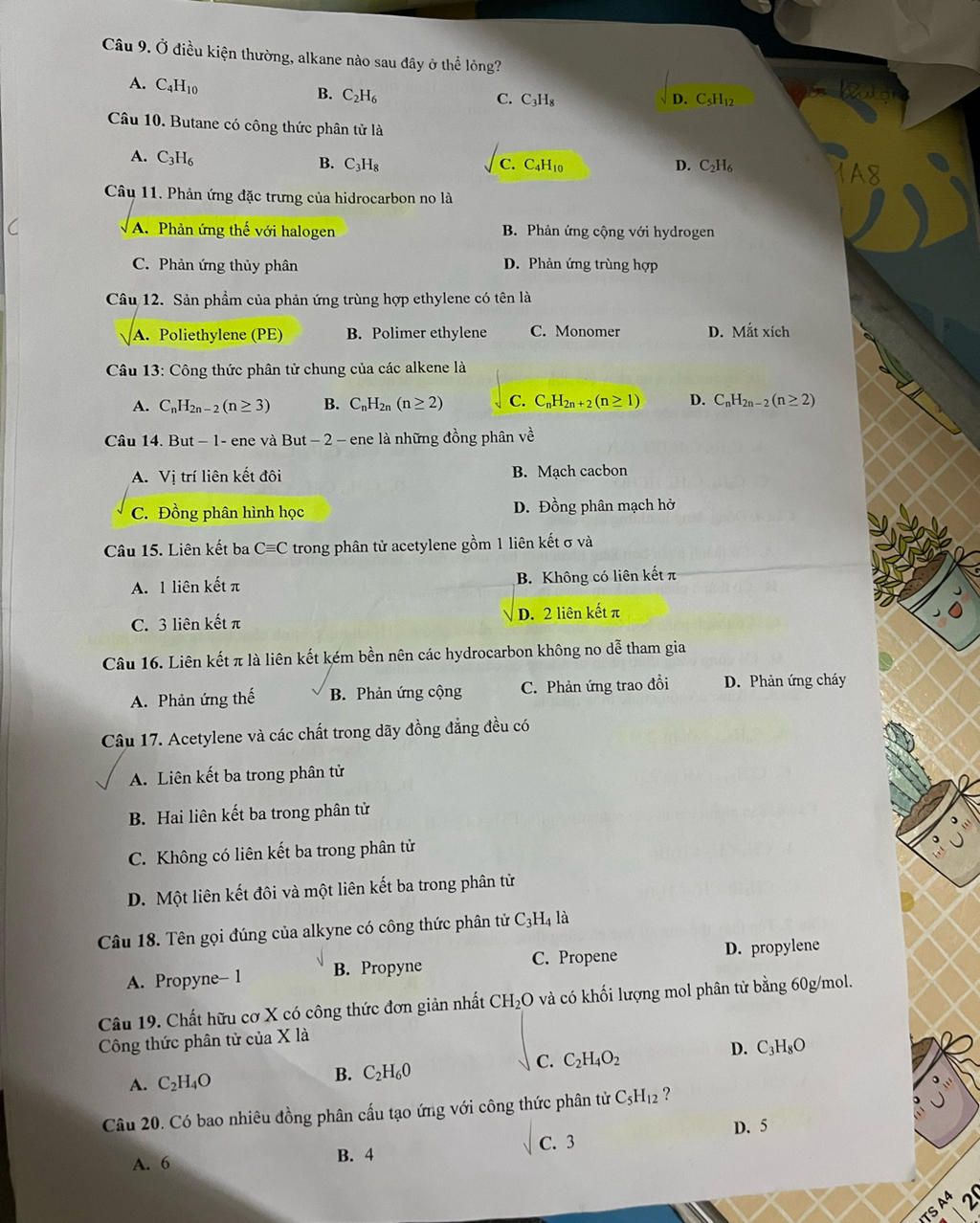 Câu 13 sai. Alkene là $C_nH_{2n}(n\ge 2)$, alkane là $C_nH_{2n+2}(n\ge 1)$ nên chọn $B$.