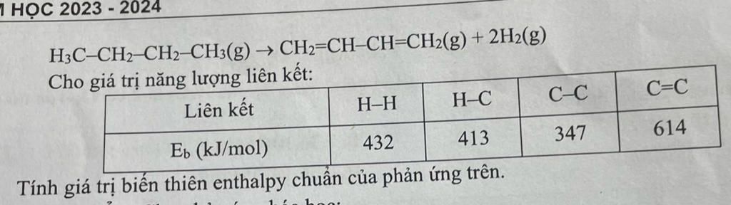 $\rm Δ_rH_{298}^°= 10E_{b\ (C-H)} +3E_{b\ (C-C)} - 6E_{b\ (C-H)} -2E_{b\ (C=C)} -E_{b\ (C-C)} -2E_{b\ (H-H)}=4×413 +2×347 -2×614-2×432=-254\ (kJ)$