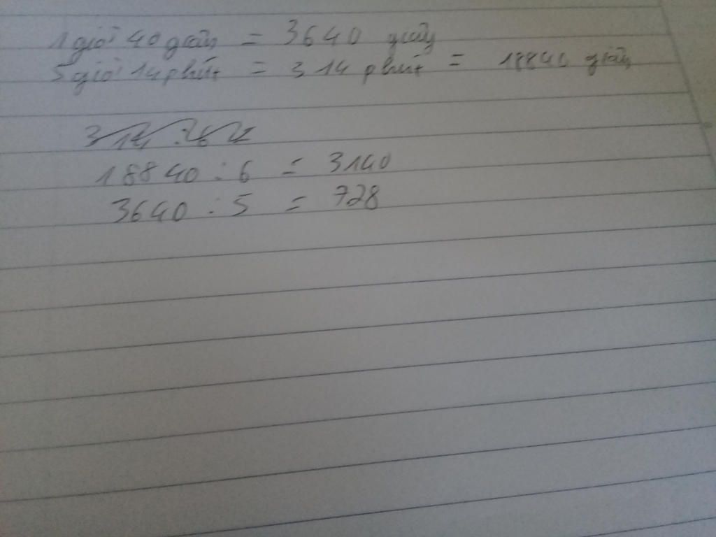 5 giờ 14 phút = 5 x 60 cộng 14=314 phút 314/6=52,33 phút 1 giờ 40 giây = 1 x60 x60 cộng 40 giây =3640 giây 3640/5=728 giây =728/60=12 phút 8 giây