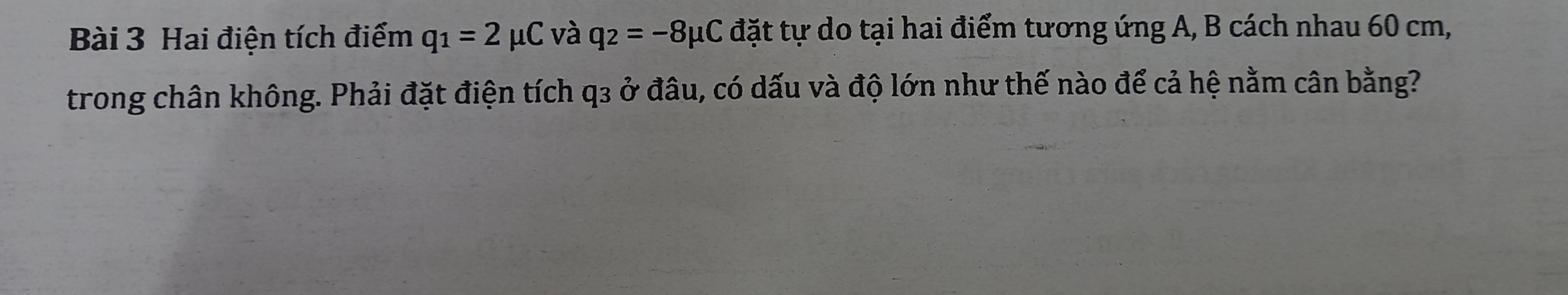 Do \({q_1},{q_2}\) trái dấu nên để \({q_3}\) cân bằng, \({q_3}\) phải nằm ngoài đoạn AB.