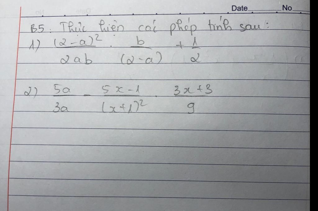 `(5a)/(3a) - (5x-1)/((x+1)^2) . (3x+3)/9` `(a\ne0;x\ne-1)`