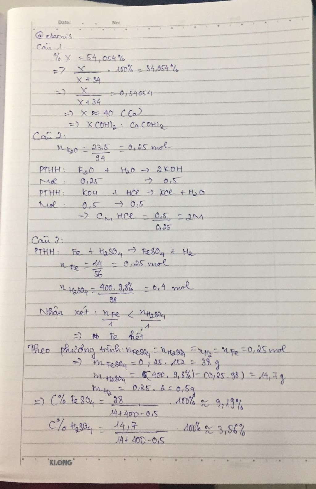 Câu 3: Hòa tan 14g iron bằng 400g dd H2SO4 9,8% .Tính nồng độ % của các chất có trong dung dịch thu được sau phản ứng.