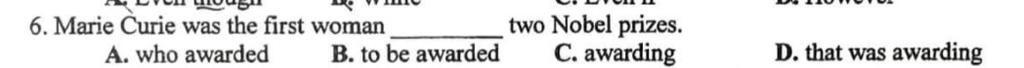 Loại C vì awarding --> hiện tại phân từ --> dùng cho chủ động