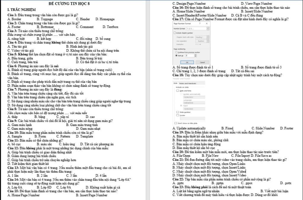 Câu 29: Đánh số trang vào vị trí giữa, bên dưới trang văn bản, ta làm thế nào?