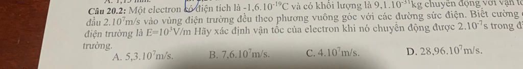 Vận tốc của electron khi nó chuyển động được `2*10^7s`: