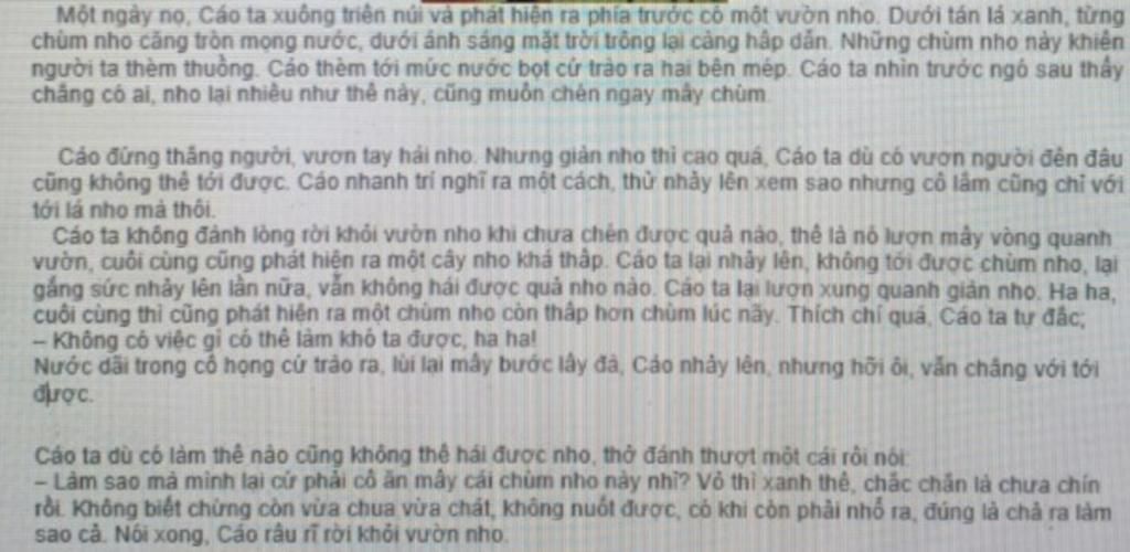 Tóm tắt: Truyện " Con Cáo và chùm nho" kể về một con cáo cảm thấy thèm khát chùm nho trong một vườn nho tươi tốt. Nhìn thấy những chùm nho mọng nước dưới tán lá xanh, con cáo cảm thấy hấp dẫn và không thể chịu đựng được sự cám dỗ.Với mục tiêu làm đủ bụng với những chùm nho ngon lành, con cáo cố gắng hái chùm nho. Nhưng giàn nho quá cao, vượt quá khả năng của con cáo. Mặc dù con cáo vươn người, nhảy lên cố gắng, nhưng chỉ đạt được lá nho và không thể với tới chùm nho thật. Con cáo quyết định thử tìm một cây nho thấp hơn để có thể hái được chùm nho. Nỗ lực của nó được đền đáp khi nó phát hiện ra một cây nho có độ cao phù hợp. Con cáo cảm thấy vui mừng và tự mãn, cho rằng không có việc gì làm khó được nó. Nhưng khi con cáo nhảy lên để hái chùm nho, lại một lần nữa, con cáo thất bại. Cáo ta dù có làm thế nào cũng không thể hái được nho. Thất vọng và mất hứng, con cáo thở đánh thượt một cái và nói rằng chùm nho chưa chín và có thể chua chát. Nó nhận ra rằng việc cố gắng hái những chùm nho này không đáng giá và có thể không mang lại sự hài lòng mà nó tưởng tượng. Cuối cùng, con cáo rầu rĩ rời khỏi vườn nho.