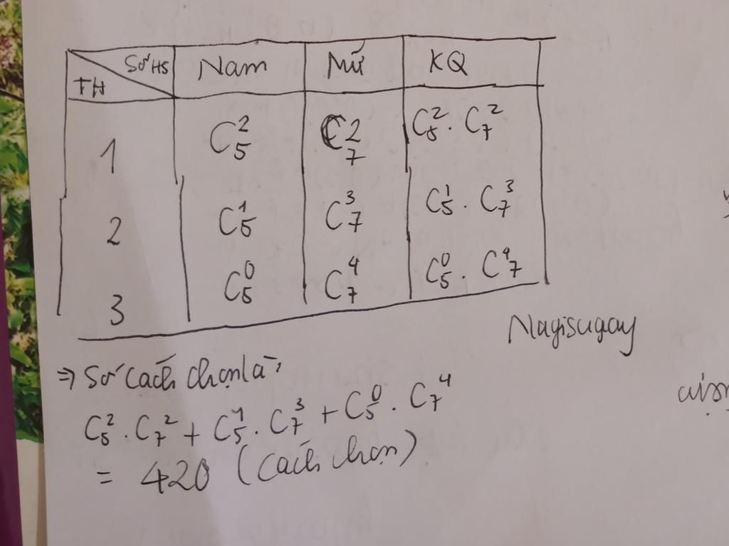 Vậy số cách chọn ra `4` học sinh sao cho có ít nhất `2` nữ là: `495 - 70 - 5 = 420` cách