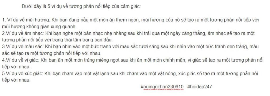 Cho 5 ví dụ về tương phản nối tiếp của cảm giác