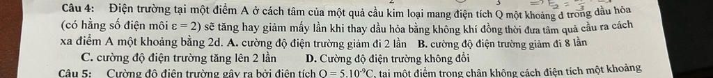 `=>` Khi thay đổi dầu hoả bằng không khí và đồng thời đưa điện tích `Q` ra xa điểm `A` một khoảng bằng `2d` thì cường độ điện trường tại điểm `A` giảm `2` lần.