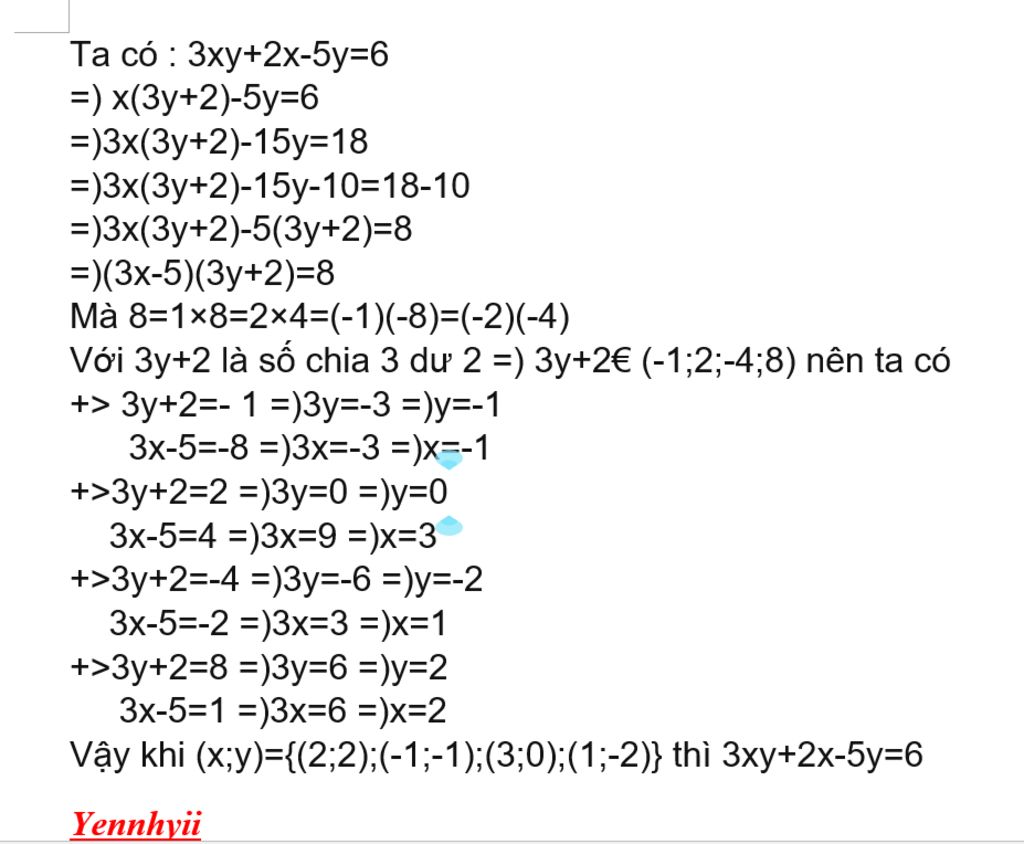Tìm cặp số nguyên xy thỏa mãn : 3xy+2x-5y=6