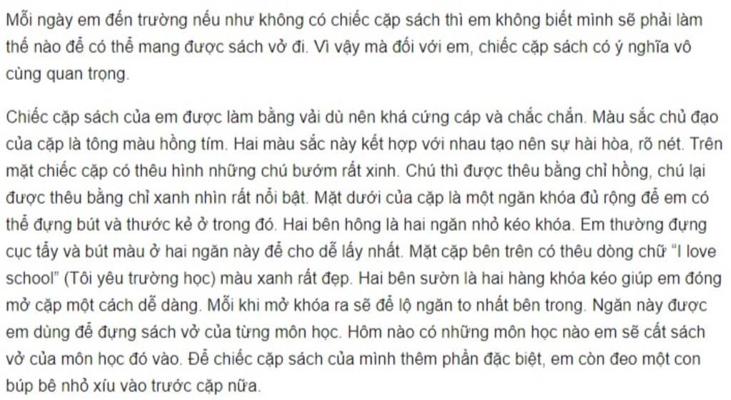 Nó không chỉ là người bạn thân hàng ngày cùng em đến trường mà nó còn là người giúp ích rất nhiều cho việc học tập của em. Chiếc cặp đã chứng kiến và lưu giữ rất nhiều kỉ niệm của tuổi học trò, nên em vẫn luôn yêu quý và giữ gìn cẩn thận dù khi lớn lên em không dùng đến nó nữa.
