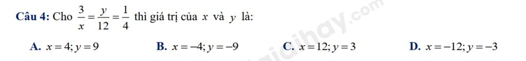 Suy ra `:` `3/x=1/4` và `y/12=1/4`