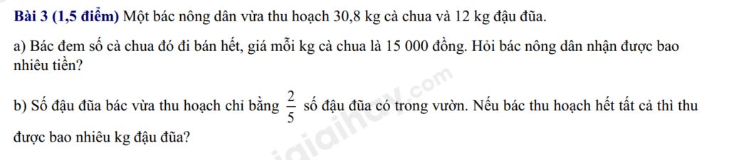 `b)` Nếu bác thu hoạch hết tất cả thì được số `kg` đậu đũa là: