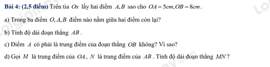 Bài 4: (2,5 điểm) Trên tia Ox lấy hai điểm A,B sao cho O4=5cm,OB=8cm.