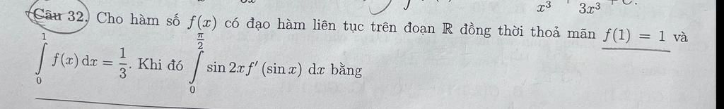 \Rightarrow \int\limits_0^{\dfrac{\pi }{2}} {f\left( {\sin x} \right)\cos xdx} = \int\limits_0^1 {f\left( t \right)dt} = \dfrac{1}{3}\\