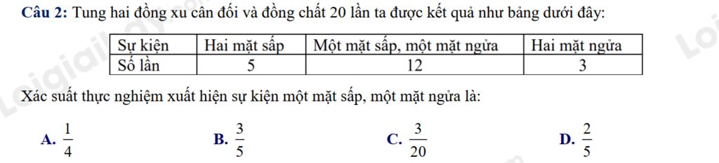 Câu 2: Tung hai đồng xu cân đối và đồng chất 20 lần ta được kết quả như bảng dưới đây: