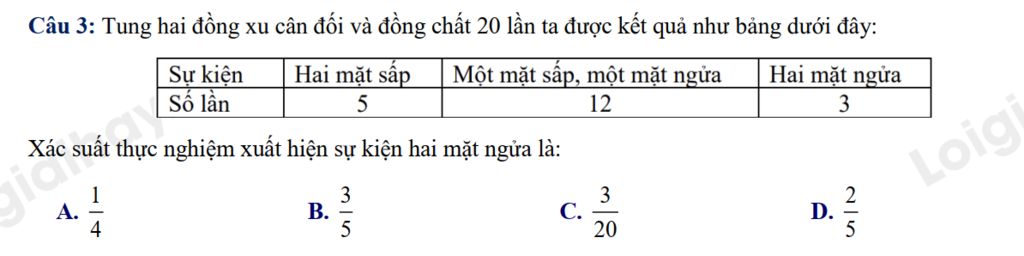 Câu 3: Tung hai đồng xu cân đối và đồng chất 20 lần ta được kết quả như bảng dưới đây: