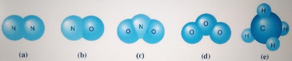 Hình a) là `N_2`, Hình b) là ` NO`, Hình c) là `N_2O`, Hình d) là `O_3` , Hình e) là `CH_4`