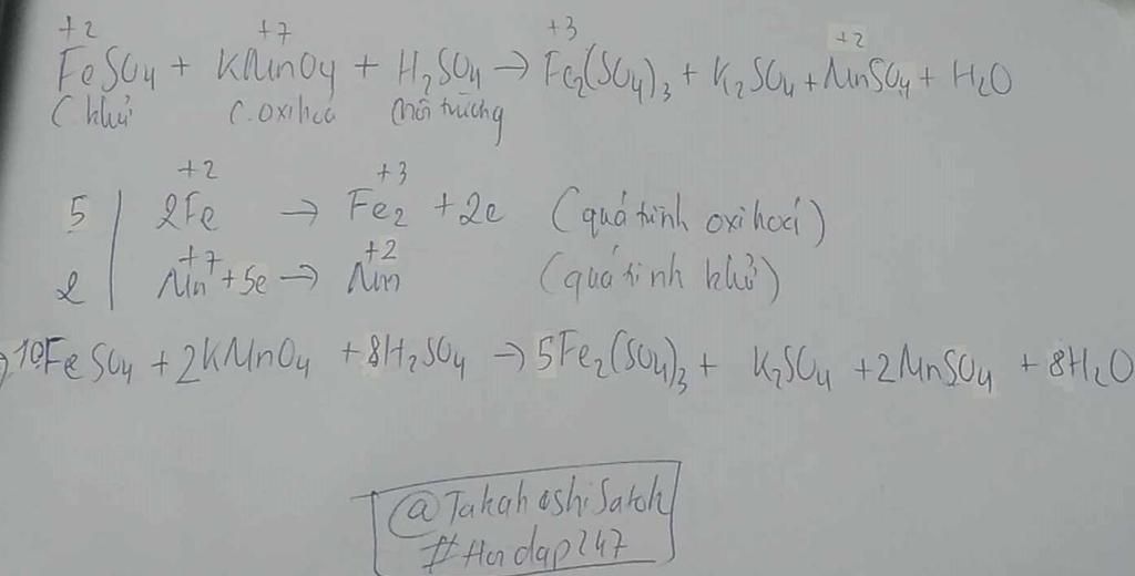 $\mathop{Fe}\limits^{+2}SO_4+K\mathop{Mn}\limits^{+7}O_4+H_2SO_4$`->`$\mathop{Fe_2}\limits^{+3}(SO_4)_3+K_2SO_4+\mathop{Mn}\limits^{+2}SO_4+H_2O$