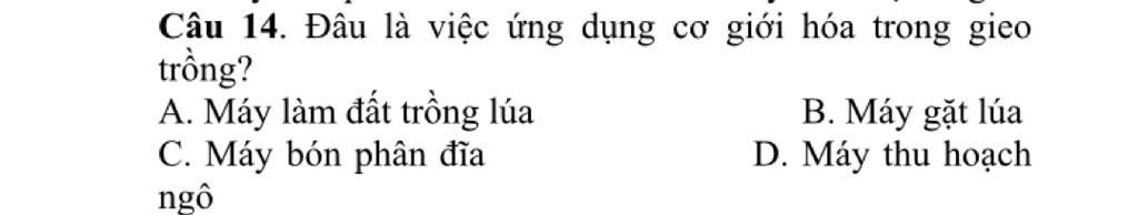 Câu 14. Đâu là việc ứng dụng cơ giới hóa trong gieo trồng?