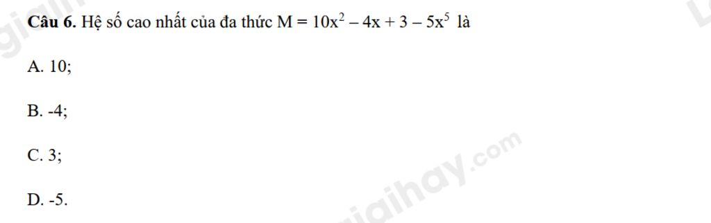 Đa thức `M=10x^2-4x+3-5x^5` có hệ số cao nhất là `-5`
