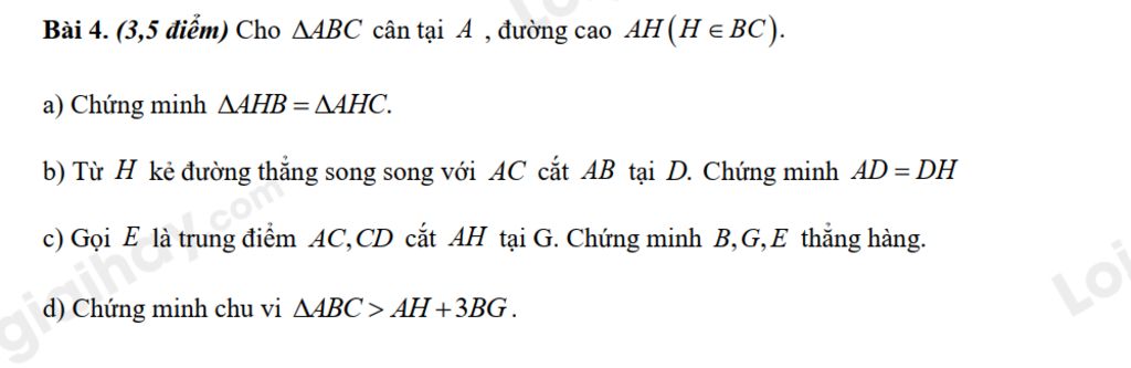 Bài 4. (3,5 điểm) Cho $\triangle$ABC cân tại A, đường cao AH(H$\in$BC).