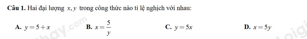 `->``bbB`$\\$Công thức tỉ lệ nghịch: `x.y=k`$\\$`x` tỉ lệ nghịch với `y` theo hệ số tỉ lệ `5` là: `x.y=5` hay `x=5/y`