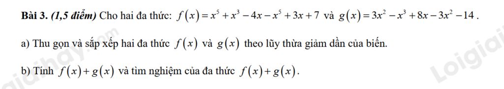 Bài 3. (1,5 điểm) Cho hai đa thức: f (x)= $x^5+ x^3 - 4x - x^5 +3x+7$ và g(x)=$3x^2 − x^3+8x-3x^2 −14$