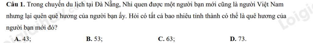 Câu 1. Trong chuyến du lịch tại Đà Nẵng, Nhi quen được một người bạn mới cũng là người Việt Nam nhưng lại quên quê hương của người bạn ấy. Hỏi có tất cả bao nhiêu tỉnh thành có thể là quê hương của người bạn mới đó?